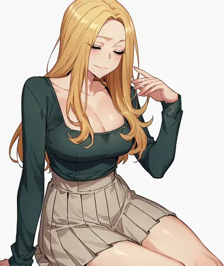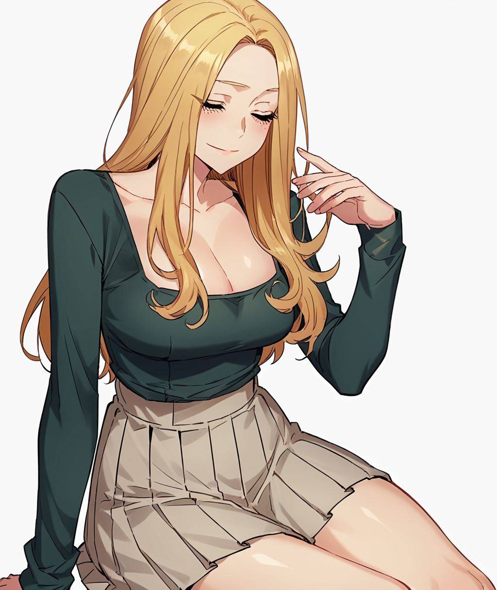 beige top, turtleneck, sleeveless, black skirt, white panties