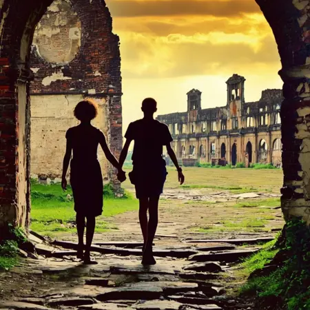 클로즈업, 원거리 촬영, 폐허가 된 건물, 균열 난 진흙, 깨진 창문, 그리고 멀어지는 인물들. 억제된 색조, 대비, 분위기.