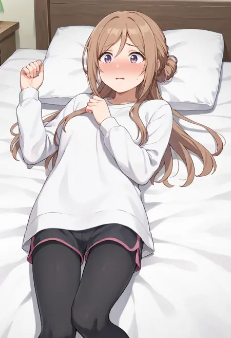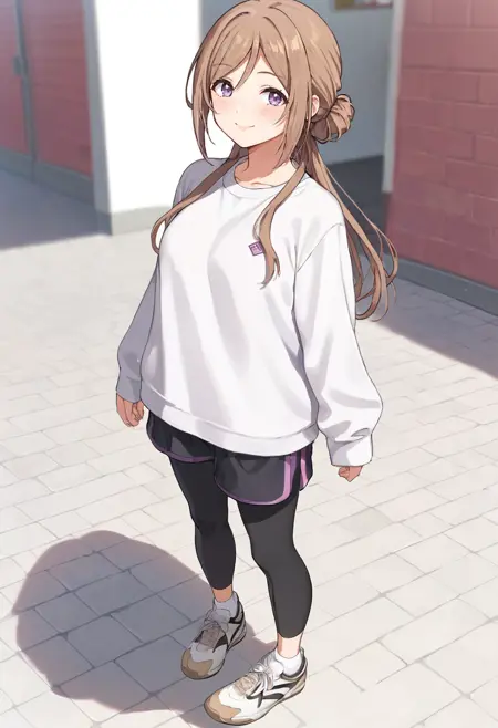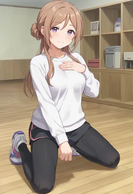 rinami-gym,himesaki rinami,purple eyes,brown hair,hair bun,long hair, white shirt, shorts,black leggings,short white socks,sneakers