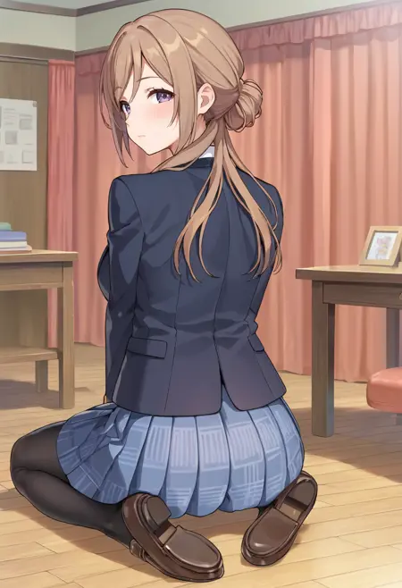 rinami-default,himesaki rinami,purple eyes,brown hair,hair bun,long hair, school uniform, blazer, blue neck ribbon, pleated skirt, black pantyhose, loafers