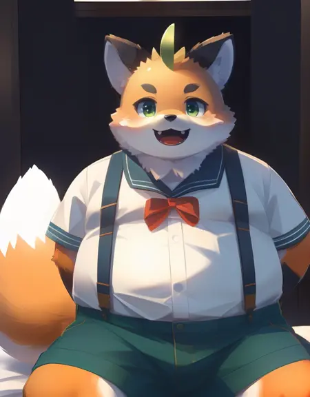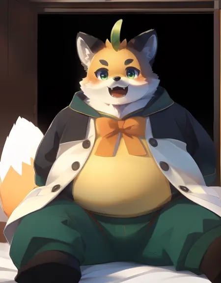 関連語:white fur, orange fur, two-tone fur, green hair, short hair, antenna hair, ahoge, leaf, green eyes, thick eyebrows, fox tail, large tail, fox boy, fox ears, animal ears, animal nose, snout, fang, sailor collar, orange scarf, suspenders, shoes, gloves, shoulder armor, japanese armor, goggles, goggles around neck, animal costume
