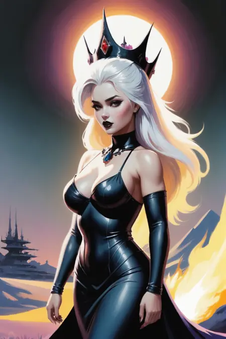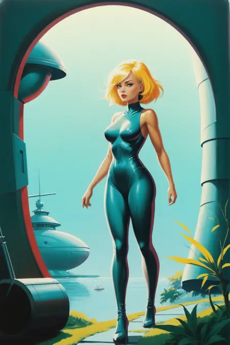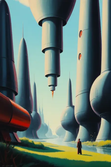 A 50s style retro scifi style with a lot of shiny metal buildings, some of which are weirdly phallic (but a cool style nonetheless). For Envy Starlight.