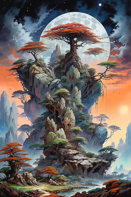스타워즈 세계관의 마스터 요다의 멀고 멀리 떨어진 행성 다고바의 환상적인 풍경 스타일.