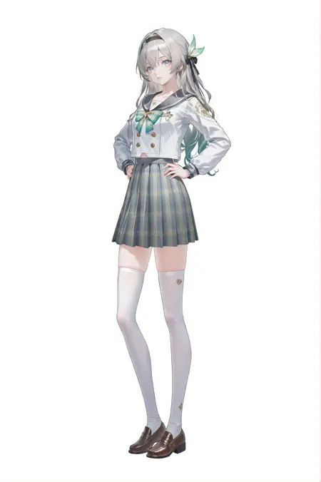 Firefly \(honkai: star rail\), Fireflychun, clothes: Fireflychun school uniform, 1girl, Fireflychun grey plaid skirt, long hair, white thighhighs, grey hair, blue eyes, sailor collar, long sleeves, hairband, bowtie