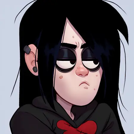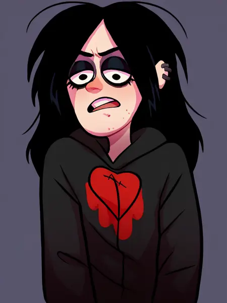 ROBBIEV,BLACK PUPILS,ACNE,GOTH,PIMPLES,HOODIES,BLACK HAIR,LONG HAIR
