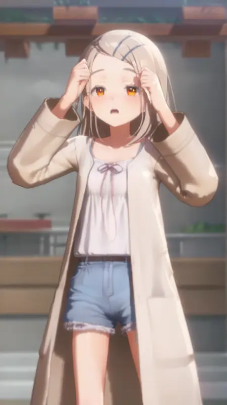normal outfit, shinosawa_hiro, 1girl, blue shorts, brown jacket, clothes hanger, collarbone, forehead, jacket, long hair, long sleeves, open clothes, open jacket, open mouth, shirt, short shorts, shorts, white shirt