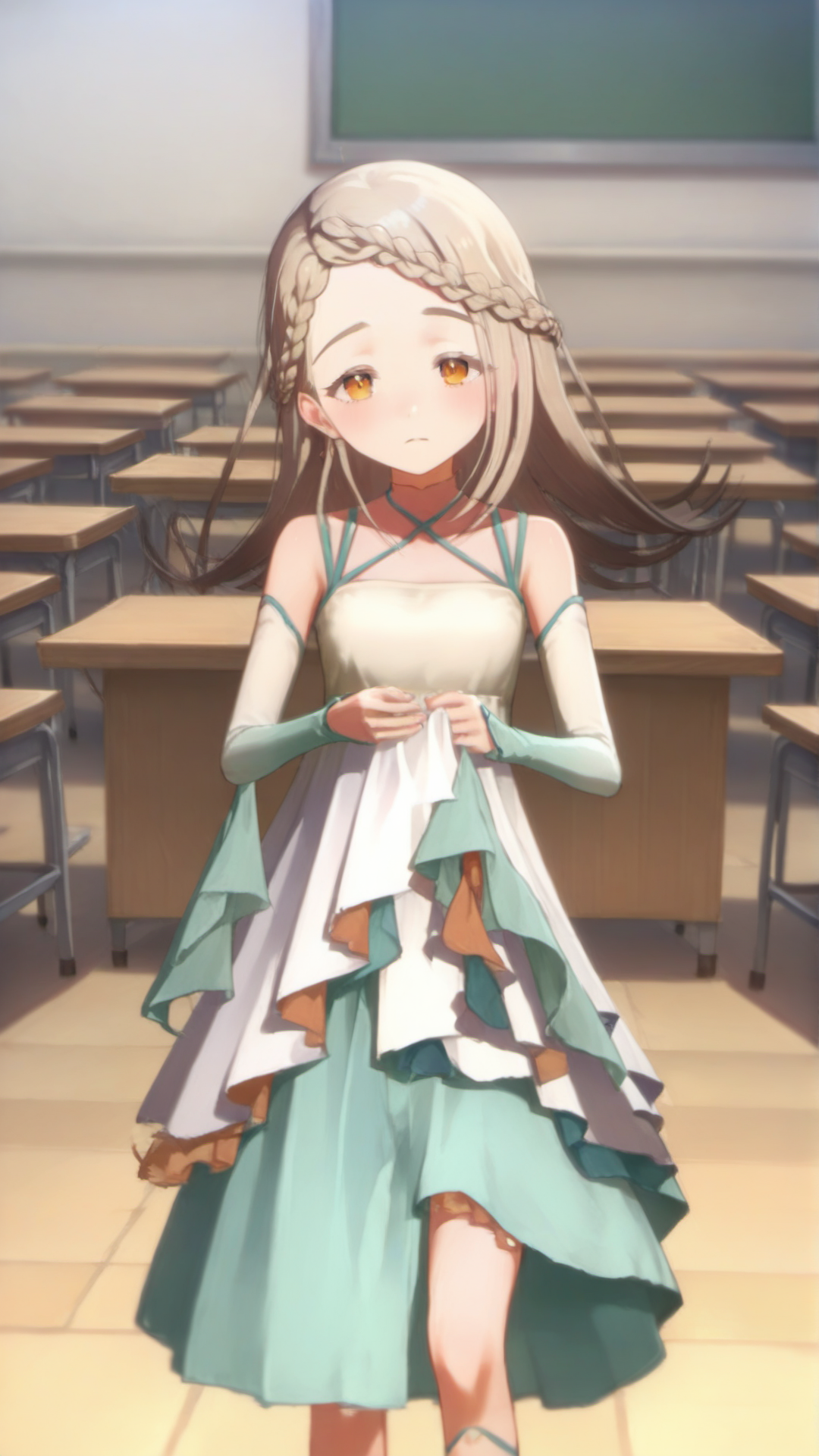 idol clothes, shinosawa_hiro, 1girl, bare shoulders, braid, braided bangs, detached sleeves, dress, jewelry,  skirt