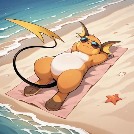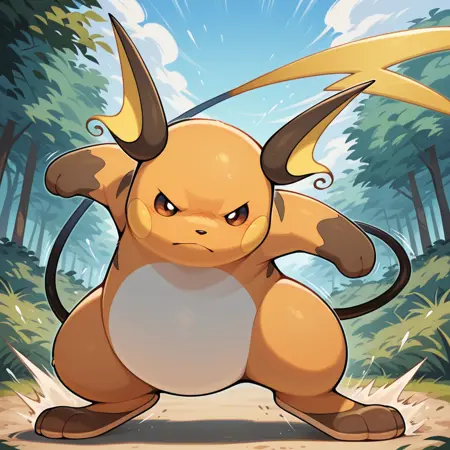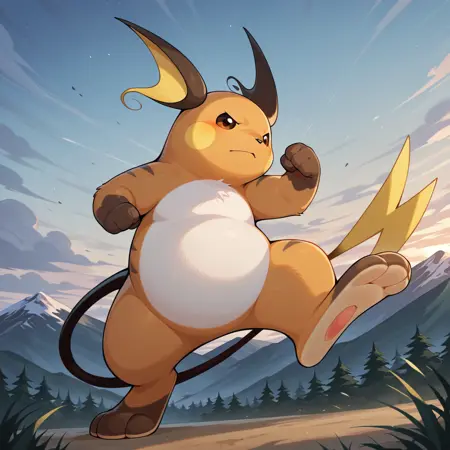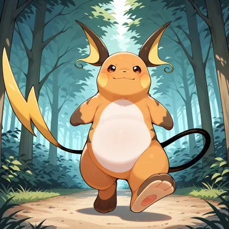 Illustrious: (raichu, pokemon (creature), orange skin, white belly, chubby, brown toes, brown hands, tan soles, single pink paw pad, chubby yellow cheeks, long tail, lighting bolt on tail, back stripes, three toes,)