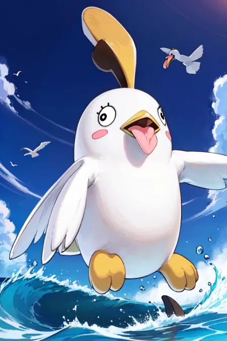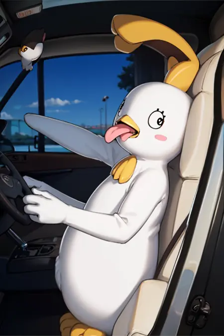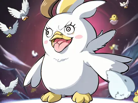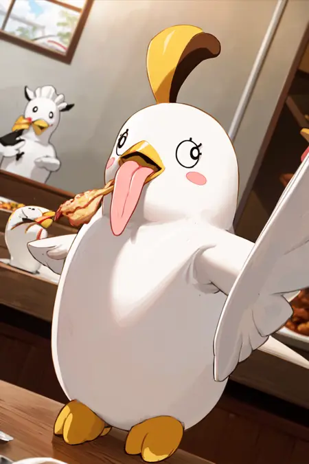 source_furry, open mouth, tongue out, no humans, (white bird:1.3), duck, blush stickers, animal focus, (peroro \(blue archive\):1.5),