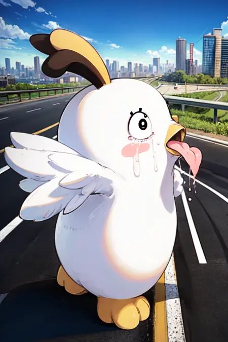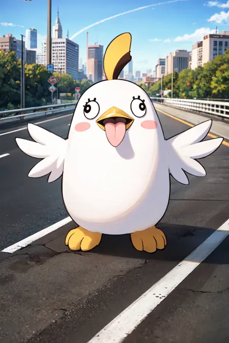 perorosama, yellow ahoge, open mouth, tongue out, black eyes, animal focus, (white bird, duck, duck feet:1.5), wings, blush stickers,
