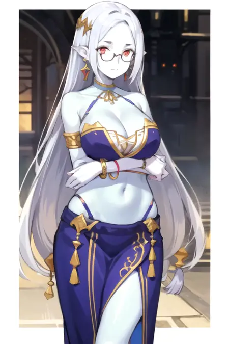 | トレーニングワード | MiReM0nster, 1girl, solo, very long hair, skirt, large breasts, hair ornament, red eyes, navel, cleavage, bare shoulders, jewelry, grey hair, earrings, glasses, pointy ears, midriff, bracelet, colored skin, ((blue skin)), armlet, adjusting eyewearコピーしました! |