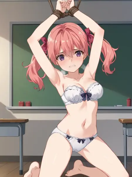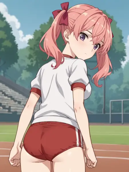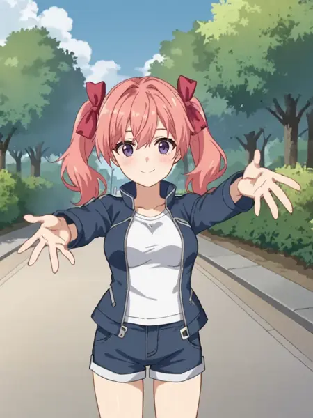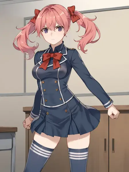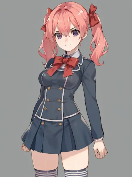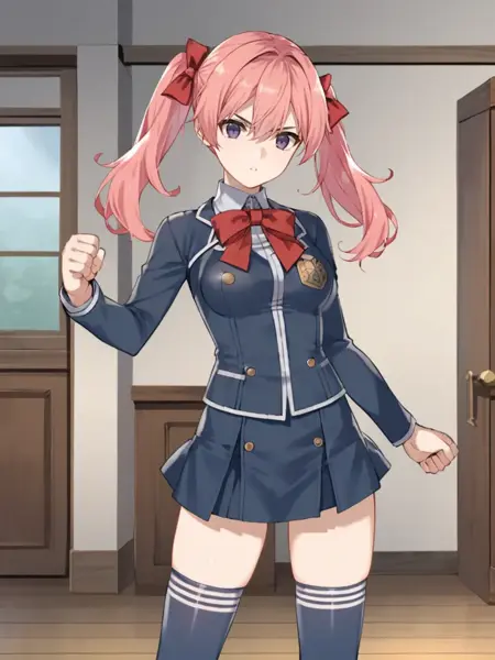 キーワード:ピンクの髪、ツインテール、パープルの目、髪飾り、濃紺のシャツ、濃紺のスカート、制服、ハイソックス、赤いリボン