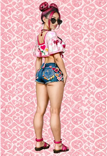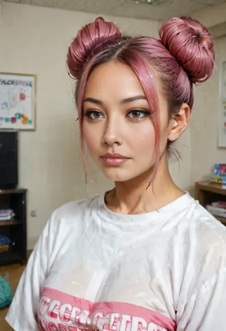 Rose의 **특징**은 분홍색 머리카락, 더블 버니, 갈색 눈입니다(더 정확한 결과를 위해 이 특징들을 프롬프트에 추가하세요).