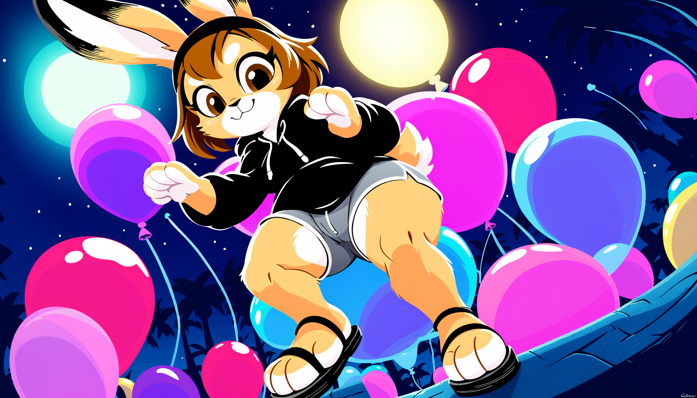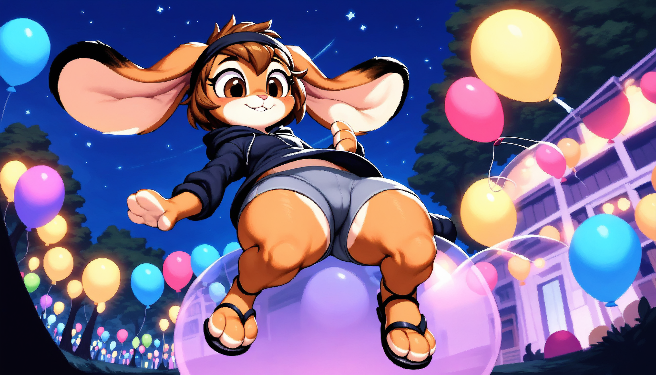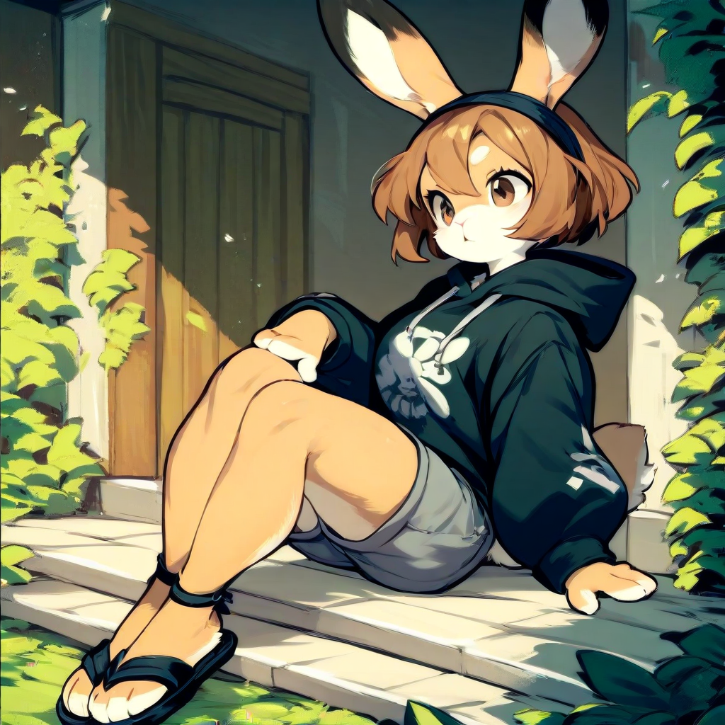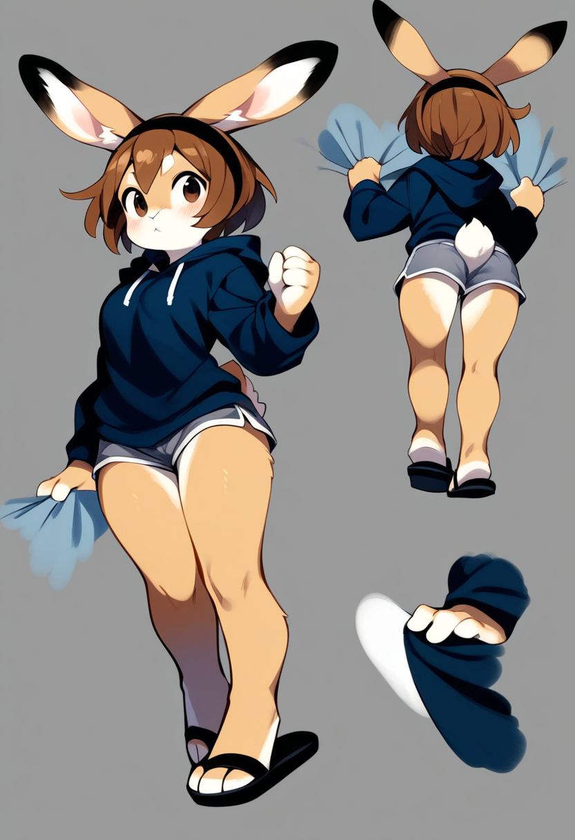 score_9, score_8_up, score_7_up, score_6_up, score_5_up, Erin, female, bunny, rabbit, brown hair, black headband, brown eyes, tan fur, white countershading, black hoodie, grey yoga shorts, black-tipped ears, long ears, black sandals, yoga shorts, athletic, safe, rating_safe,