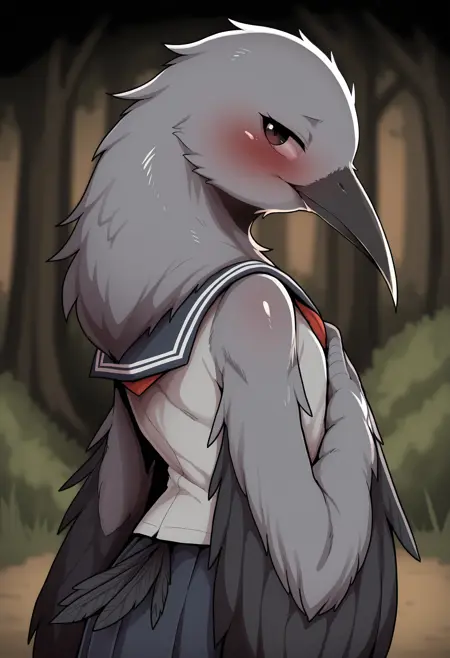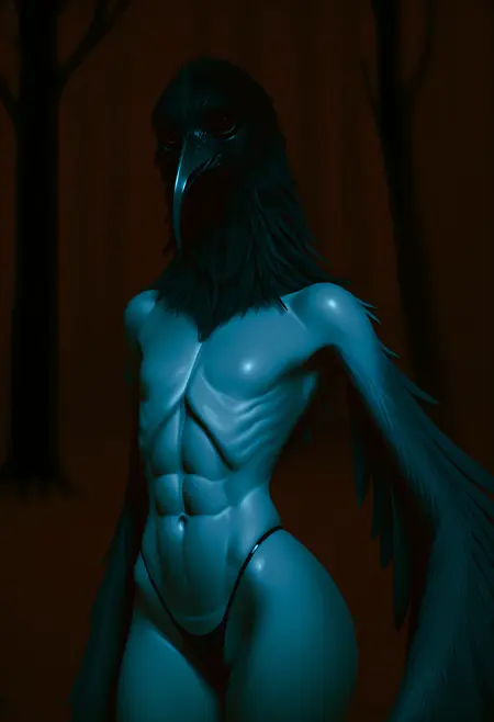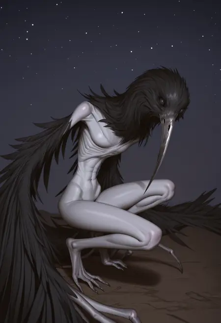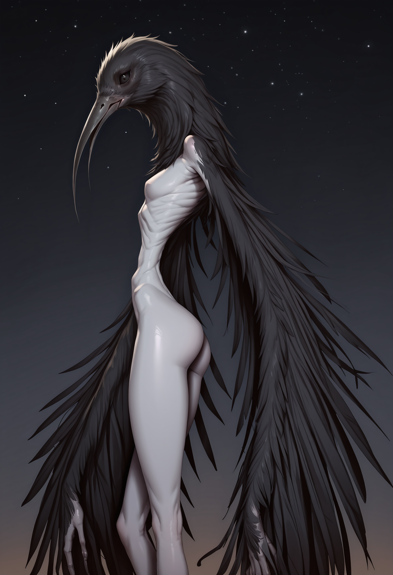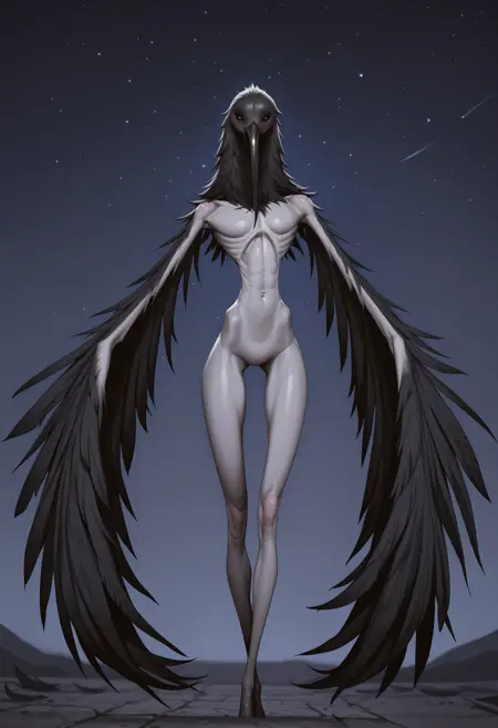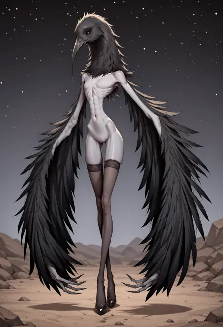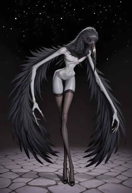• 1girl, no humans, colored skin, gray skin, wings, beak, slender legs, slender arms, skinny