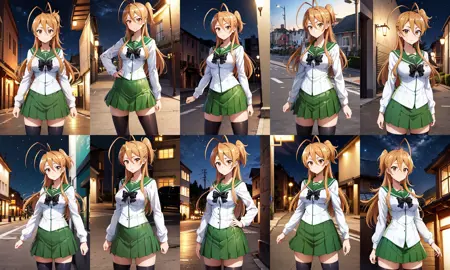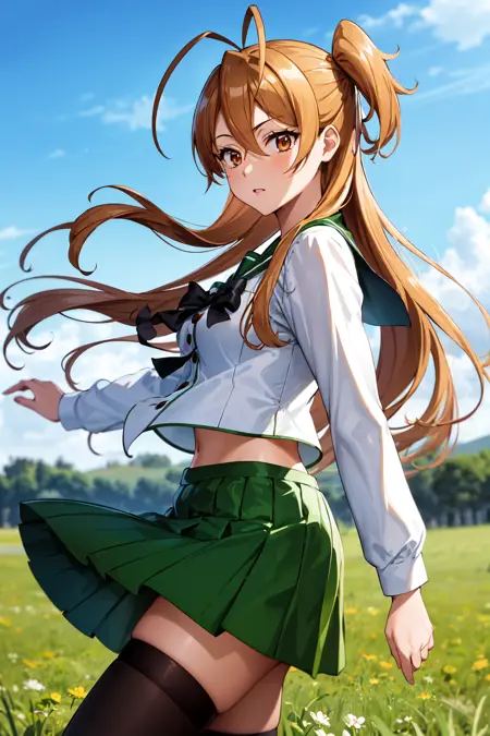 outfit11girl, solo, long hair, brown hair, antenna hair, brown eyes, school uniform, green sailor collar, black bowtie, white shirt, long sleeves, pleated skirt, green skirt, black thighhighs