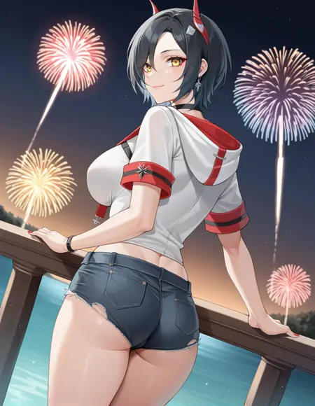 トリガー語: ulrich von hutten \(azur lane\), 1girl, 黒髪, 黄色の目, 赤い角, 片目に髪をかけた, 短髪, 赤いネイル