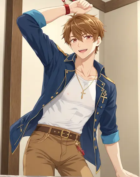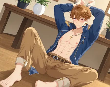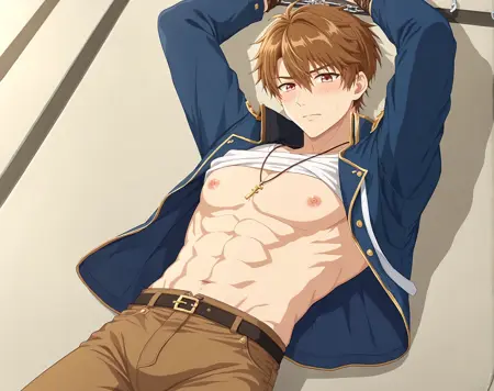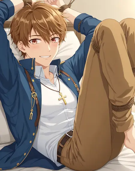 key, brown pants, white shirt, abs, cross necklace, jewelry, handcuffs, blue jacket, shirt lift, long sleeves, open clothes,cuffs, bound wrists,