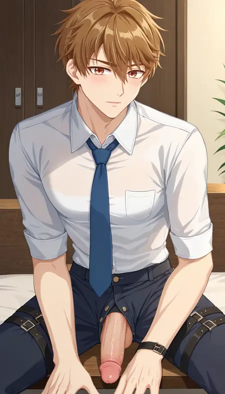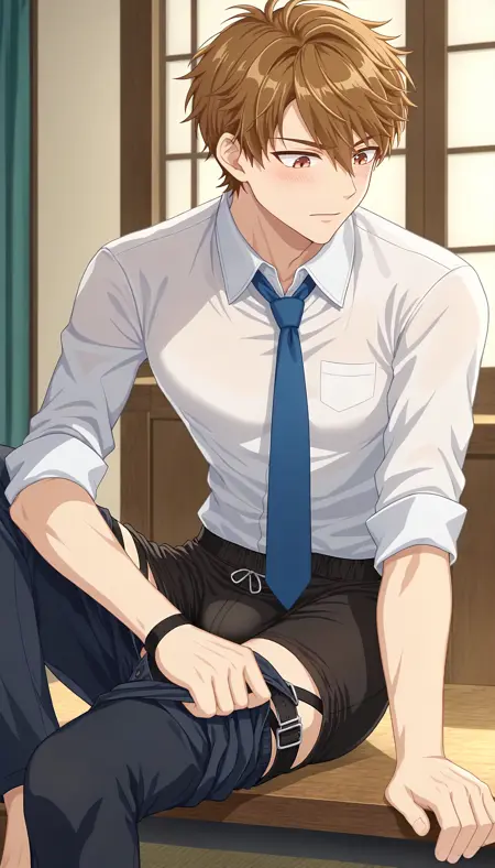 white shirt, blue necktie, long sleeves, collared shirt, male underwear, thigh strap, belt,
