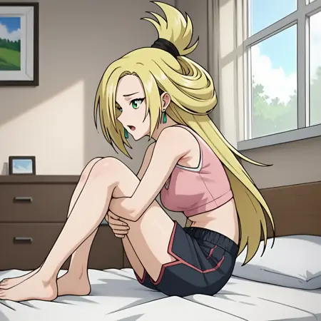 1girl, solo, tatsunagi_kourin_uniform, blonde hair, green eyes, long hair, forehead, topknot, hair tie, single hair ring, earrings, chinese clothes, martial arts belt, white pants, high heels
