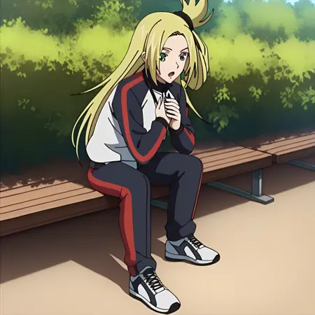 1girl, solo, tatsunagi_kourin_gym, blonde hair, green eyes, long hair, forehead, topknot, hair tie, single hair ring, earrings, medium breasts, track suit, track jacket, track pants, id card, sneakers, white sneakers