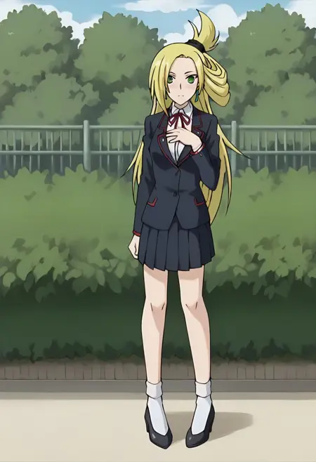 1girl, solo, tatsunagi_kourin_school, blonde hair, green eyes, long hair, forehead, topknot, hair tie, single hair ring, earrings, blazer, school uniform, medium breasts, red ribbon, skirt, pleated skirt, black skirt, black heels, socks