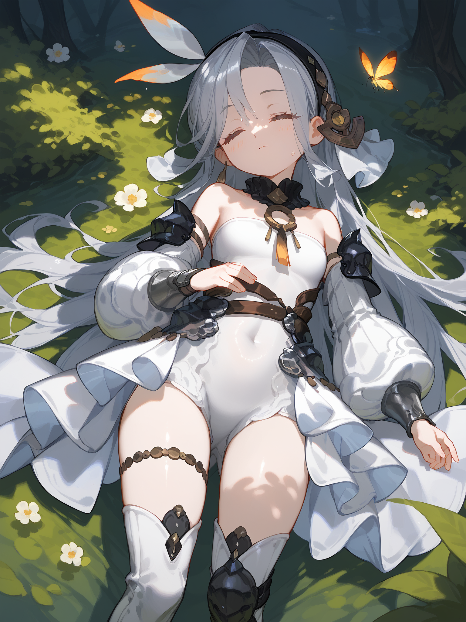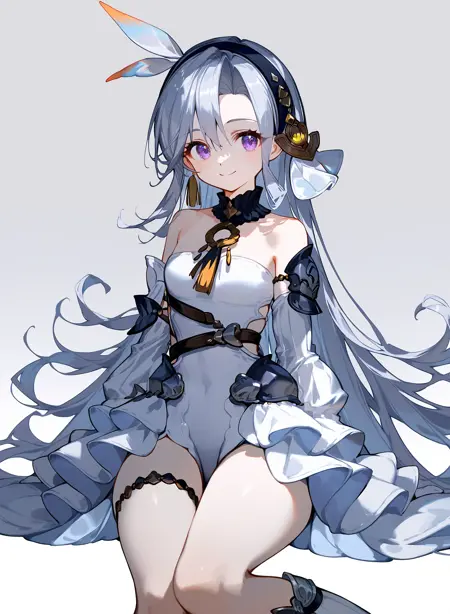 long hair,purple eyes,grey hair,tassel,solo,bare shoulders,detached sleeves,dress,looking at viewer,hairband,covered navel,thigh strap,armor,leotard,thigh_boots ,hair ornament,jewelry,singel earring,collar,belt,