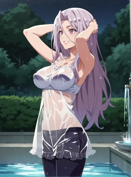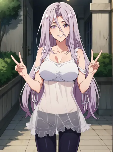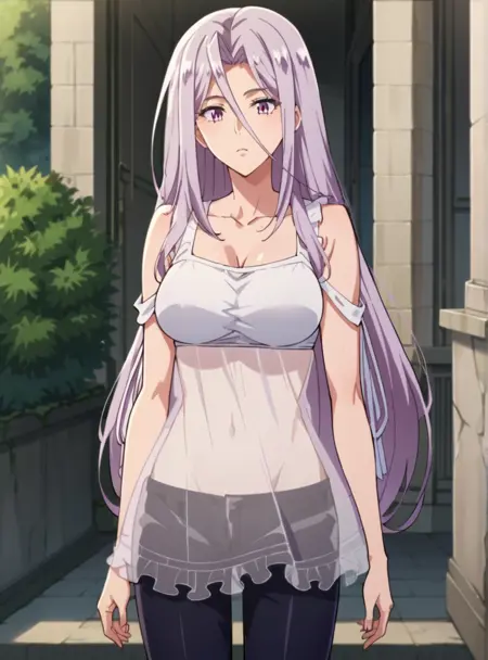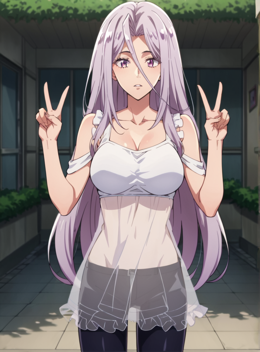 提示词:长发、紫色眼睛、紫色头发、大乳房、裤子、裙子、透明