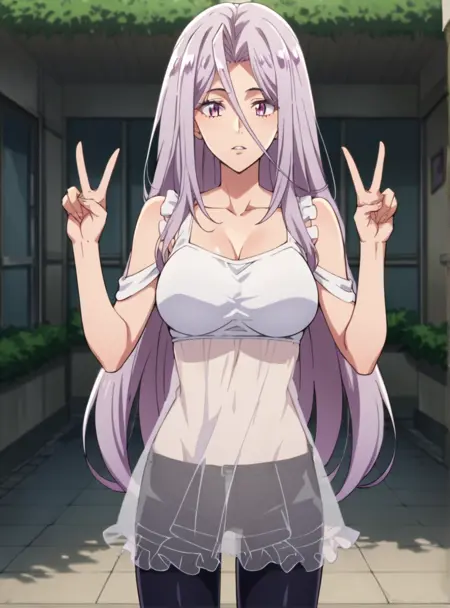 프롬프트: 긴 머리, 보라색 눈, 보라색 머리, 큰 가슴, 바지, 드레스, 투명한,