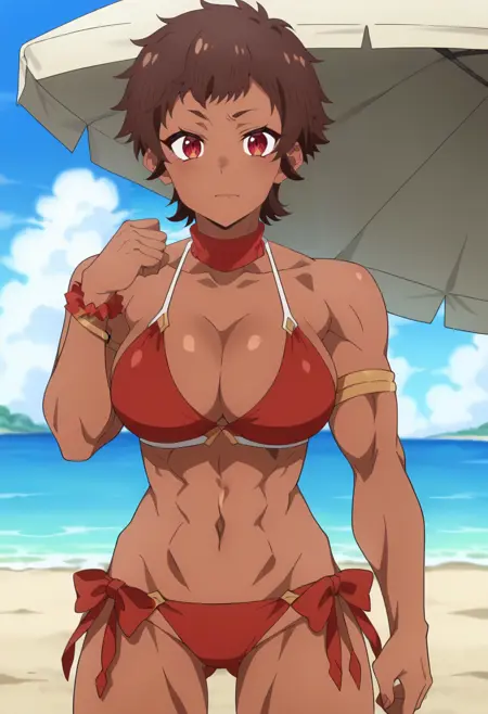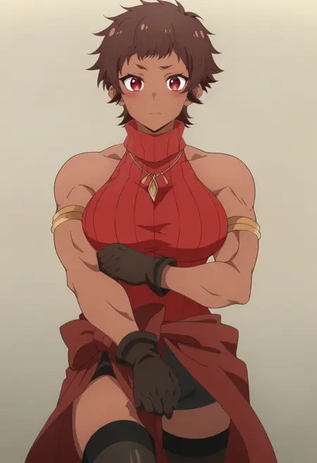 outfit: navel, red armor, abs, garter straps, midriff, short shorts, black shorts, black thighhighs, gauntlets, muscular, pauldrons, bikini armor