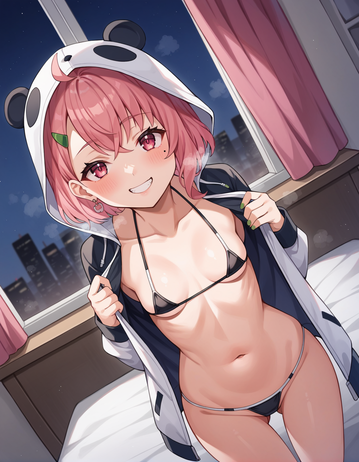 후드를 제거하려면 “animal hood, panda hood, hood up”을 삭제하고 대신 “hooded jacket”을 추가하세요.