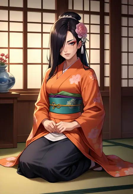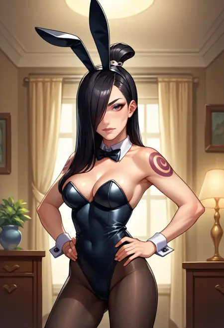 JuneAvatar, makeup, shoulder tattoo, black hair, hair over one eye, long hair, topknot