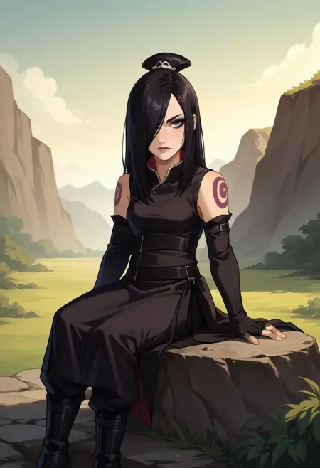 JuneAvatar, makeup, shoulder tattoo, black hair, hair over one eye, long hair, topknot, black dress, sleeveless, elbow gloves, black gloves, fingerless gloves, black belt, black pants, black boots