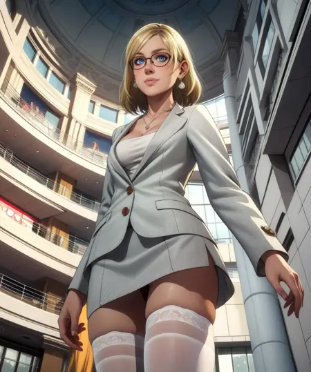 スーツ、胸元の露出、ドレススカート、ネックレス、白い太ももハイ、白い下着、ヒール