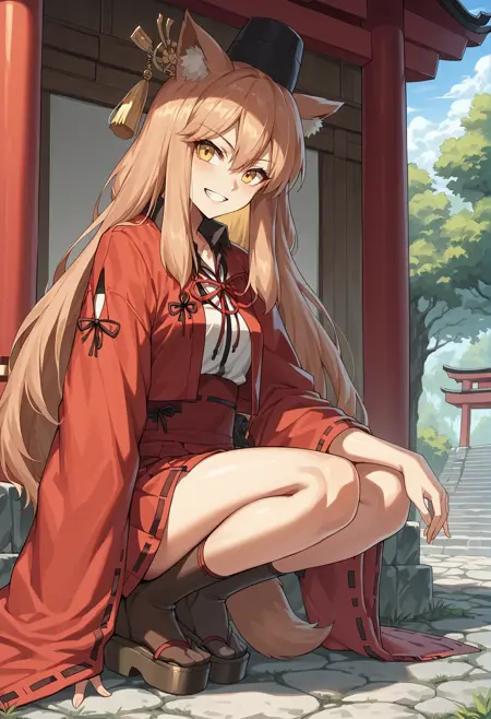 Asc2: 狐の耳、狐の尾、黄色い目、茶色の髪、長い髪、巫女、和服、リボン、白いシャツ、赤いジャケット、長い袖、広い袖、ミニスカート、サイドスリット、帽子