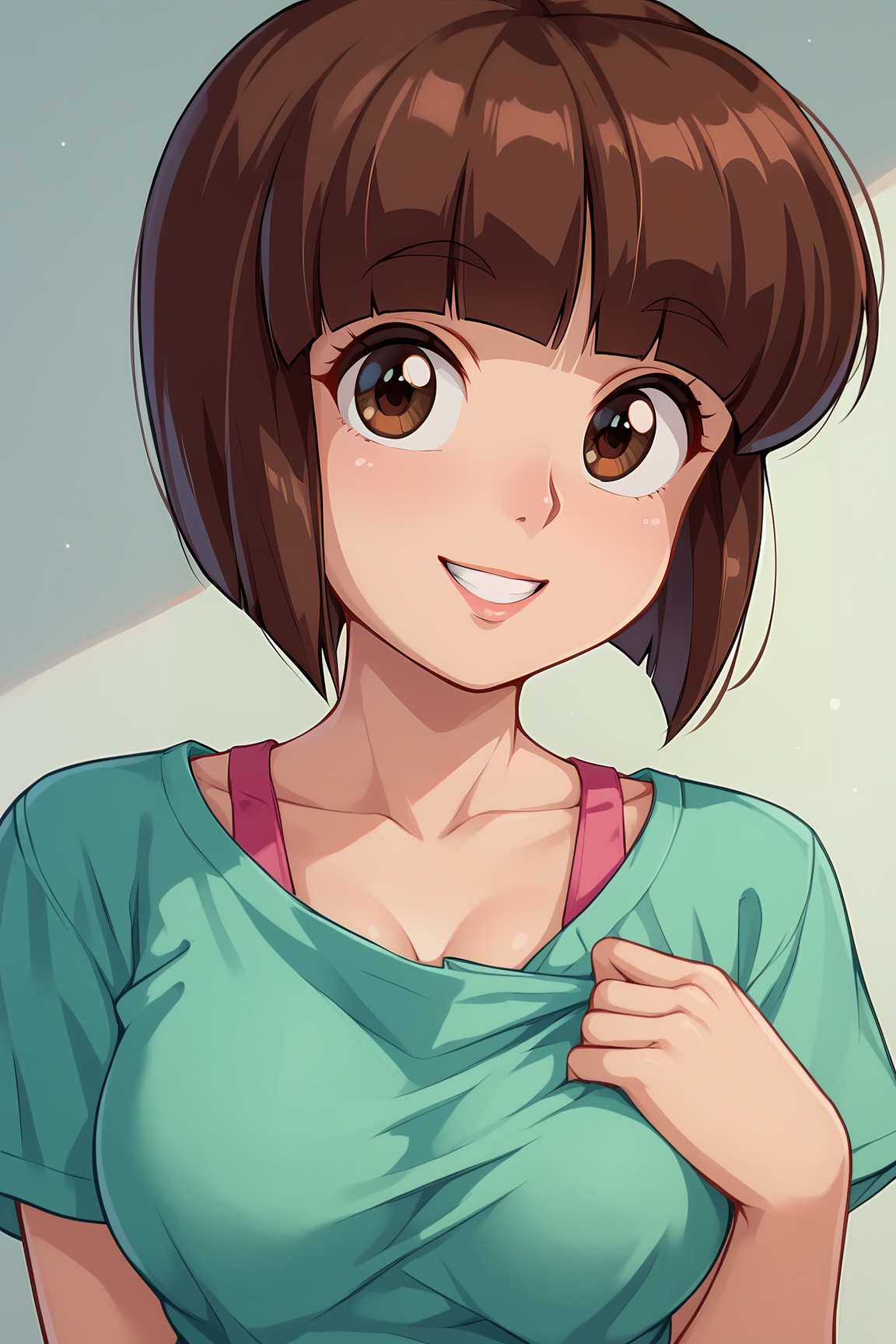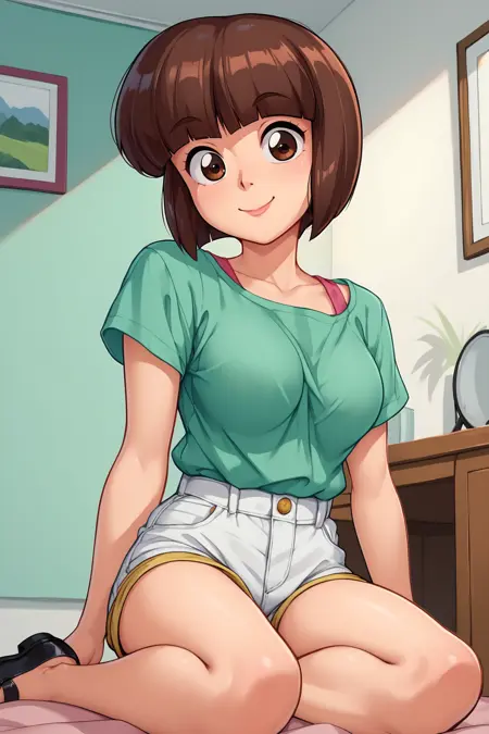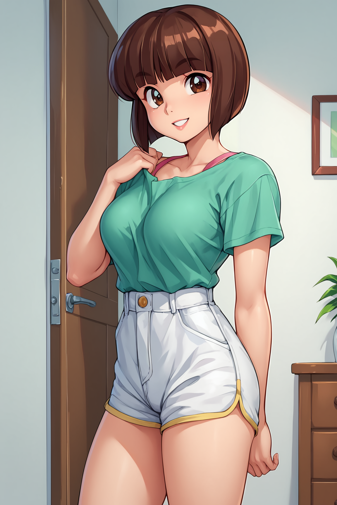 ➜ NabikiTendouRXLv2, 18歳, 大きな目, 茶色の目, 茶色の髪, 短い髪, ボブカット, まっすぐな前髪, 中程度の胸, 短い袖, ゆるいシャツ, ピンクのストラップ, 緑のシャツ, 白いショートパンツ, 黒い靴