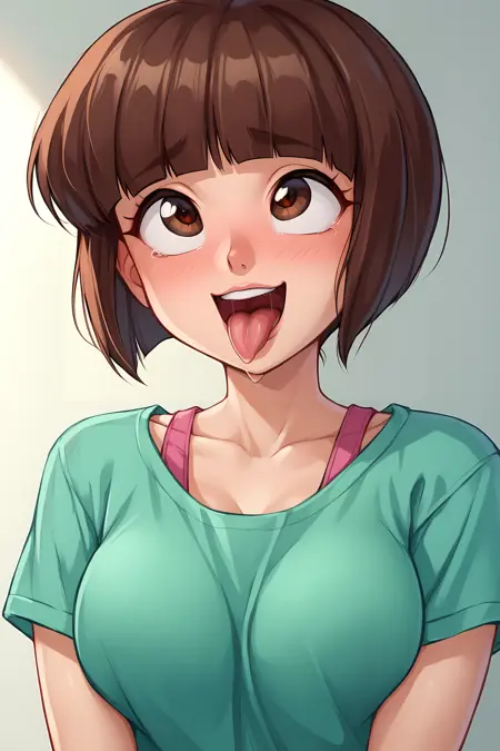 ➜ NabikiTendouRXL, 18歳, 大きな目, 茶色の目, 茶色の髪, 短い髪, ボブカット, まっすぐな前髪, 中程度の胸, 短い袖, ゆるいシャツ, ピンクのストラップ, 緑のシャツ, 白いショートパンツ