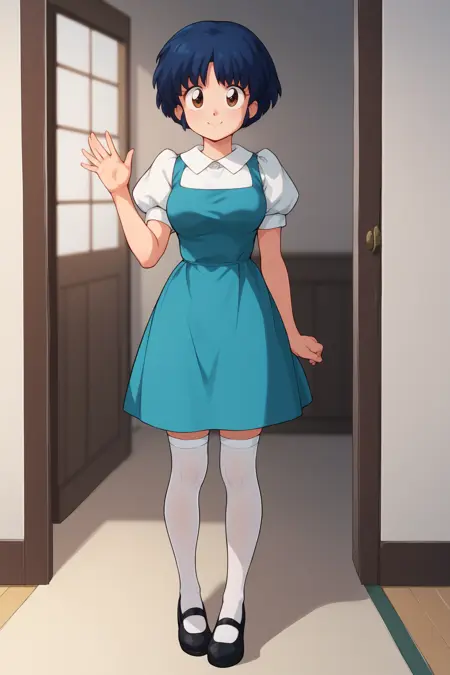 ➜ AkaneTendouRXL, 成熟した女性, 大きな目, 茶色の目, 深い青髪, 短髪, 前髪, 中程度の胸, シャツの襟, 白いシャツ, 青いドレス, 短い袖, フリル袖, 白いストッキング, 黒い靴