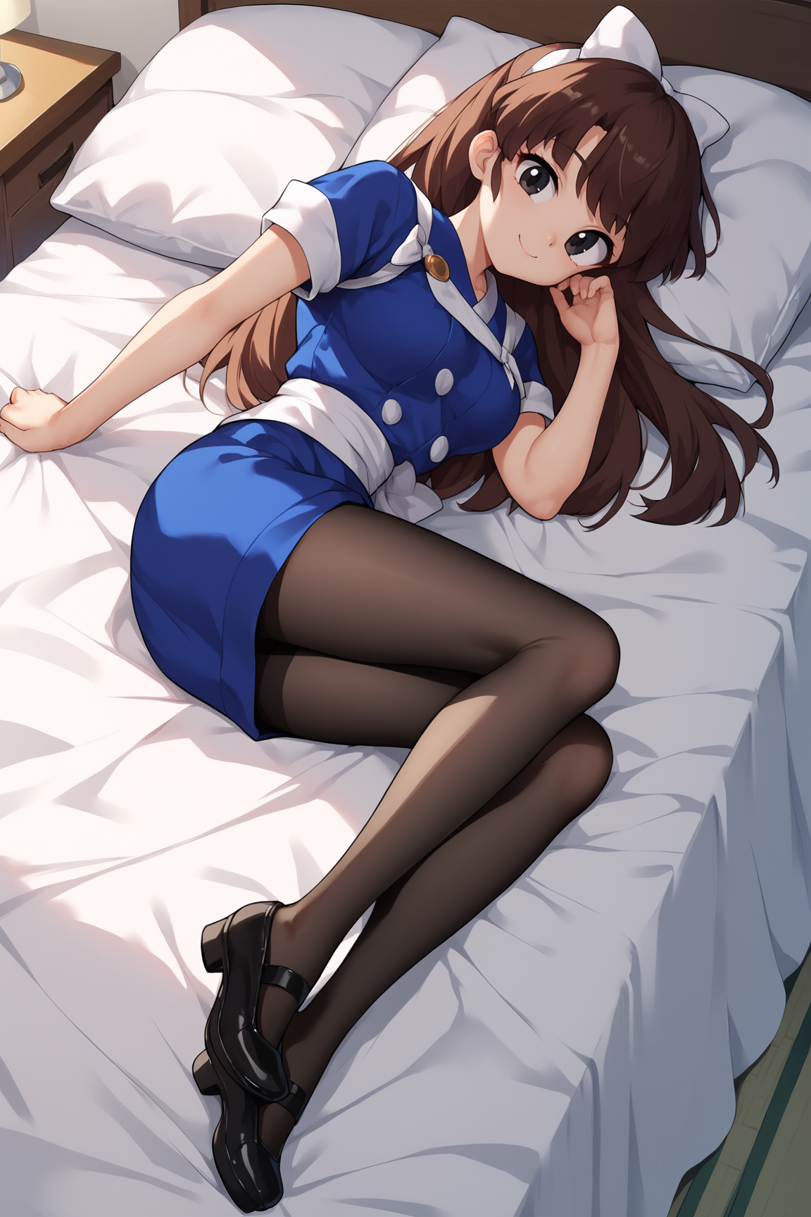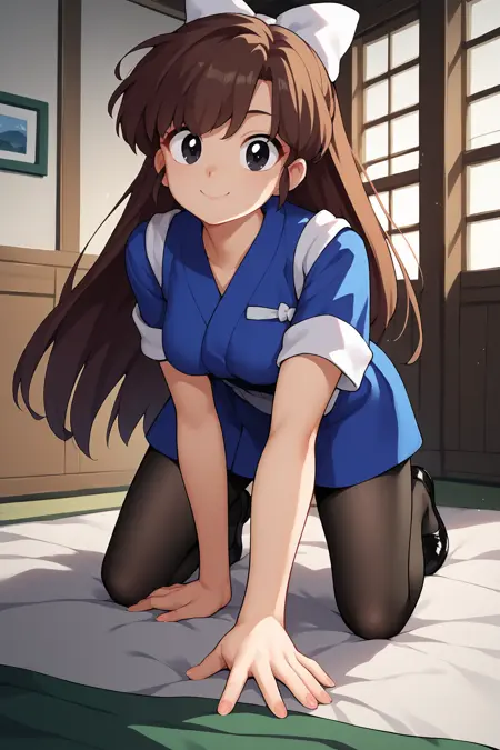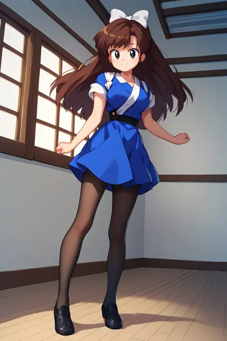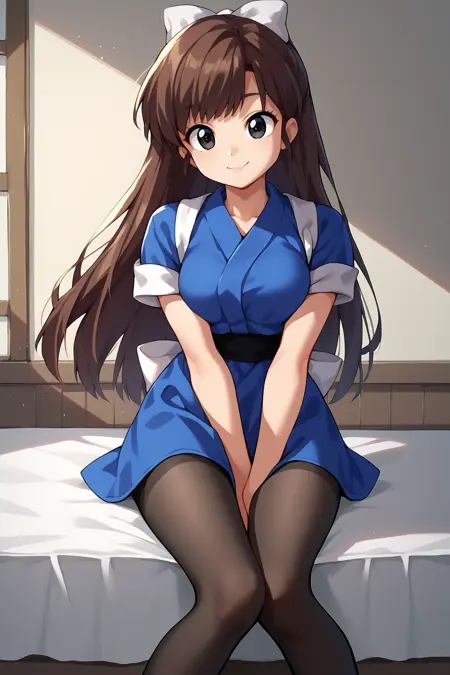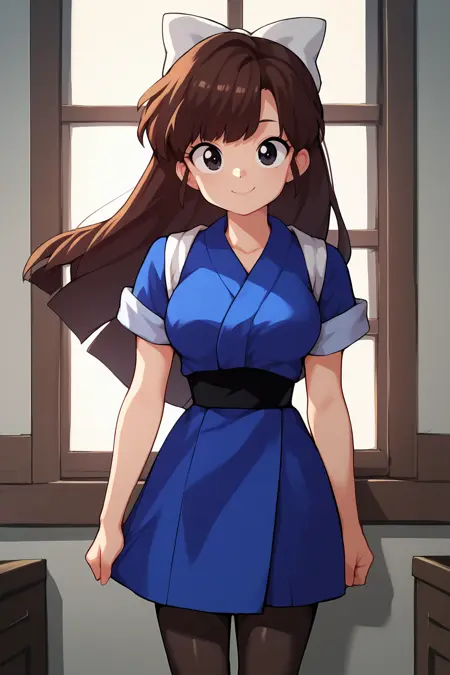 ➜ UkyoKuonjiRXL, 成熟した女性, 大きな目, 黒い目, 茶色の髪, 長い髪, 前髪, 髪に白いリボン, 中程度の胸, 短い袖, 青い着物, 白いタスキ, 黒いパンティーストッキング, 黒い靴