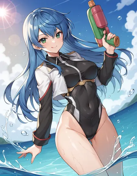 トリガー単語:maria traydor, 1girl, blue hair, long hair, green eyes