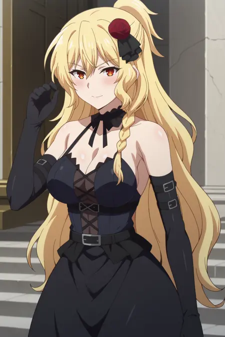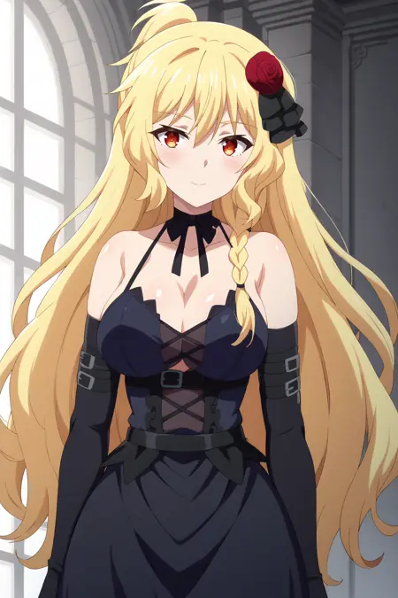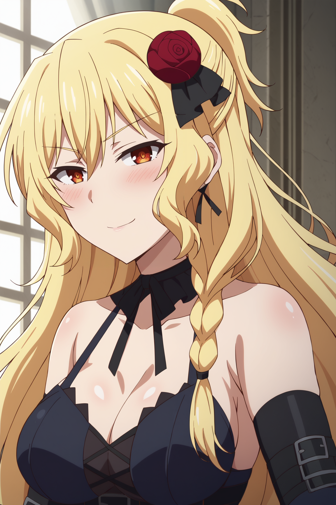 1girl, celica arfonia, rokudenashi majutsu koushi to akashic record, red eyes, blonde hair, long hair, side braid, hair flower, hair ornament, rose, large breasts,