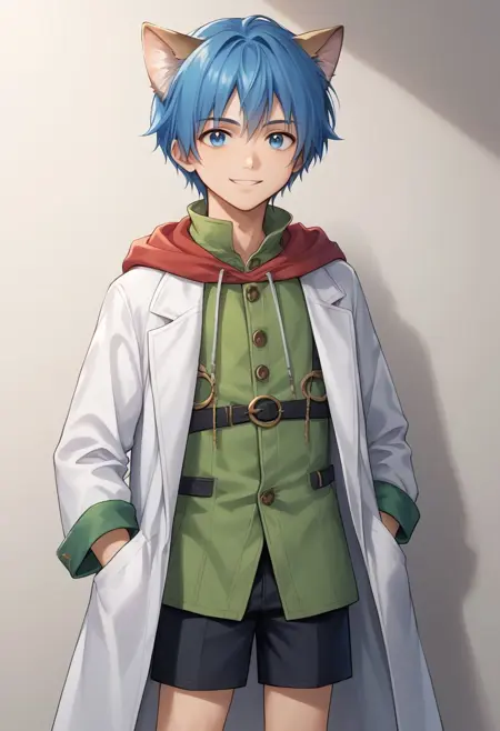 leon, 1boy, animal ears, male focus, blue hair. blue eyes, cat ears, shorts, coat, white coat, hood, vest, green vest,