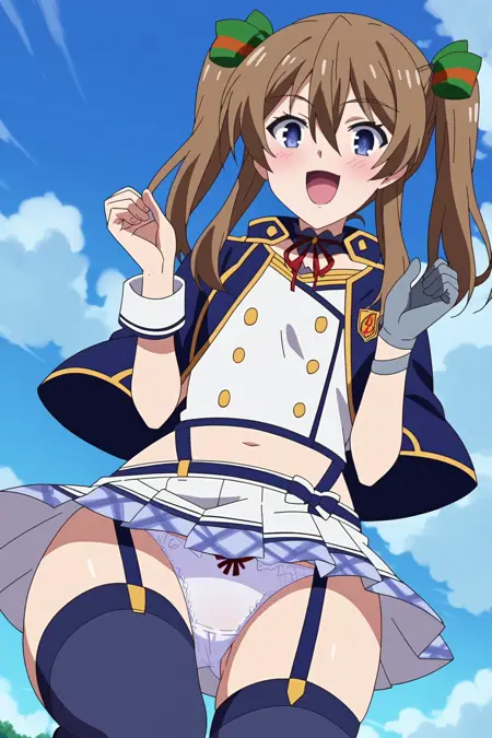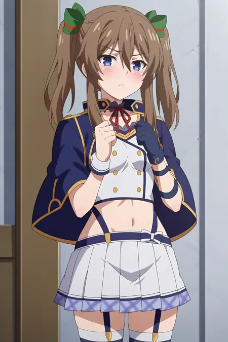alzano school uniform, blue capelet, blue thighhighs, neck ribbon, choker, garter straps, single wrist cuff, single grey glove, uneven gloves, pleated skirt, suspender skirt, midriff,