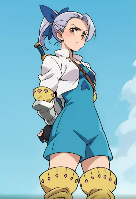 衣装1: カーポットジャケット、青いドレス、ガントレット、フィンガーレスグローブ、太ももブーツ、背中に武器、