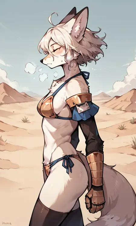 dinah, blue eyes, white fur, furry, fox girl, bikini armor,