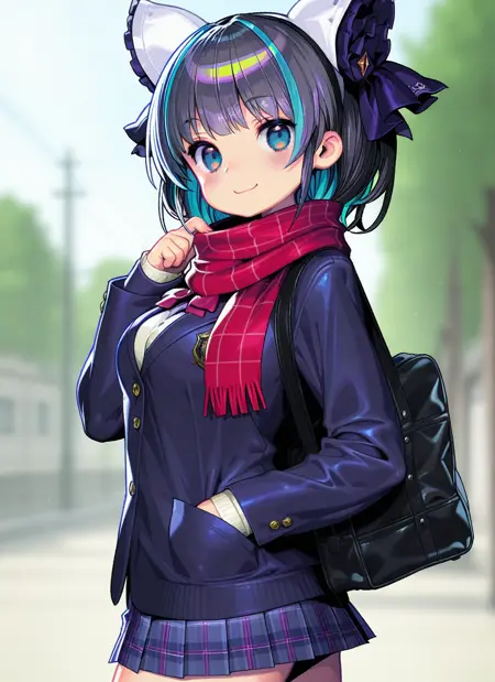绚烂夜梦(魔法帽中的猫):柴郡猫(碧蓝航线),多彩发色,高顶帽,表情包服饰,反向着装,连裤袜,胸帘,遮盖肚脐,透视,朱丽叶袖,蝴蝶结