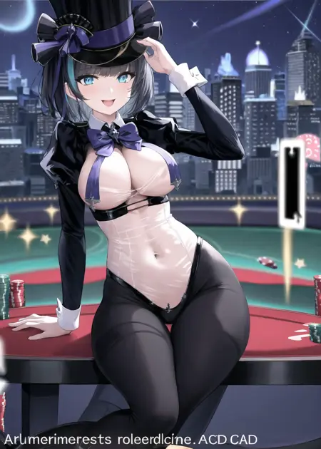 绚烂夜梦(魔法帽中的猫):柴郡猫(碧蓝航线),多彩发色,高顶帽,表情包服饰,反向着装,连裤袜,胸帘,遮盖肚脐,透视,朱丽叶袖,蝴蝶结