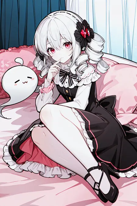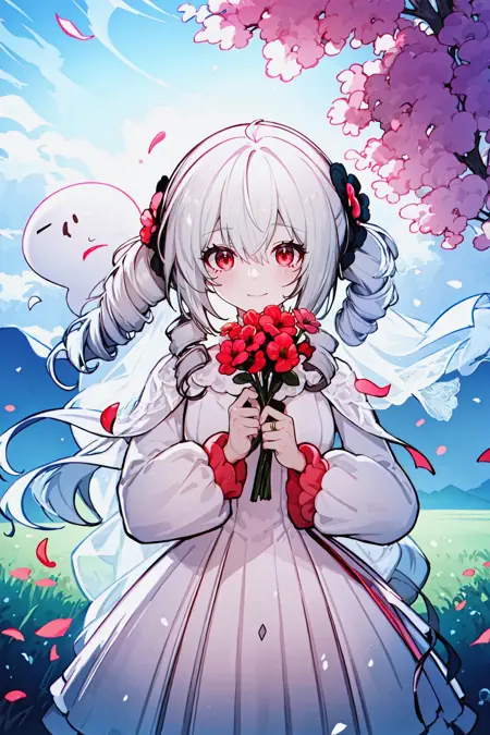 特波莉卡——tebolika_normal, drill hair, grey hair, hair flower, red eyes,twin drills,black dress, pink bow, black flower,