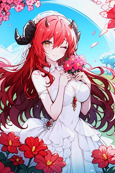 芙耶娜——yefuna_normal,red hair,white dress,heterochromia, purple eyes, yellow eyes,short skirt, horns, short skirt, white skirt,