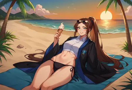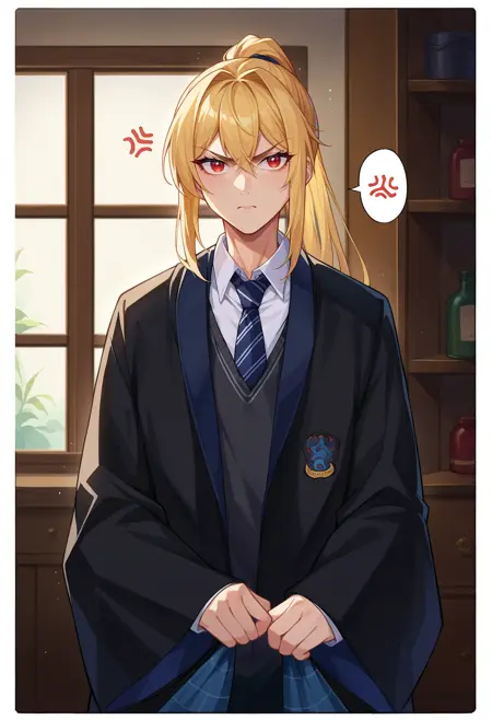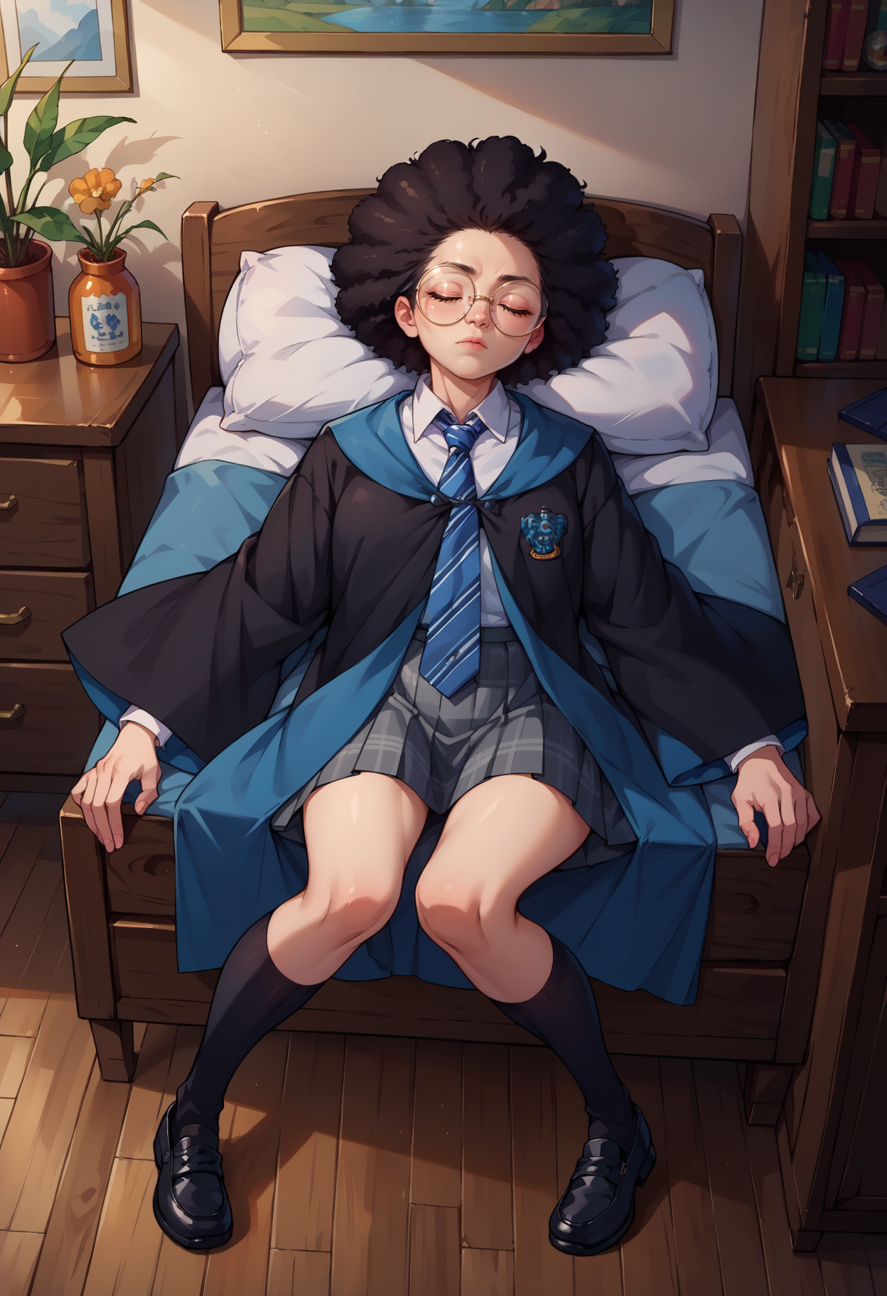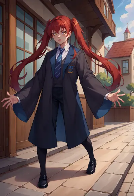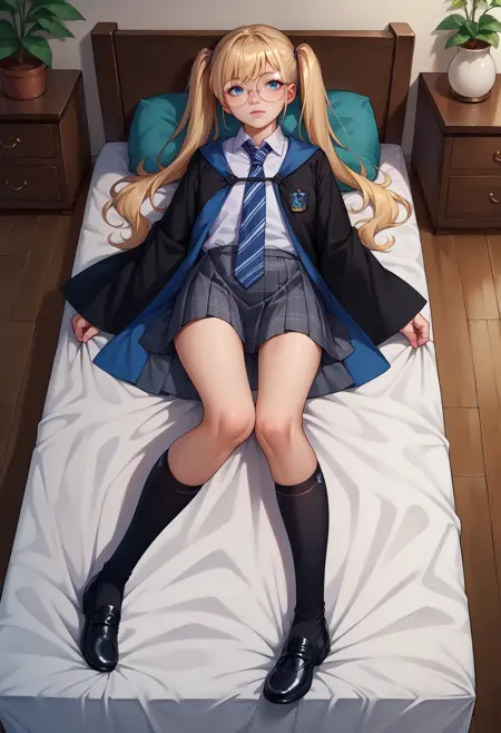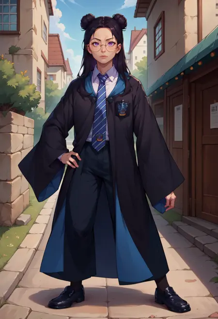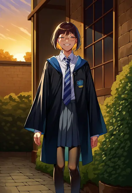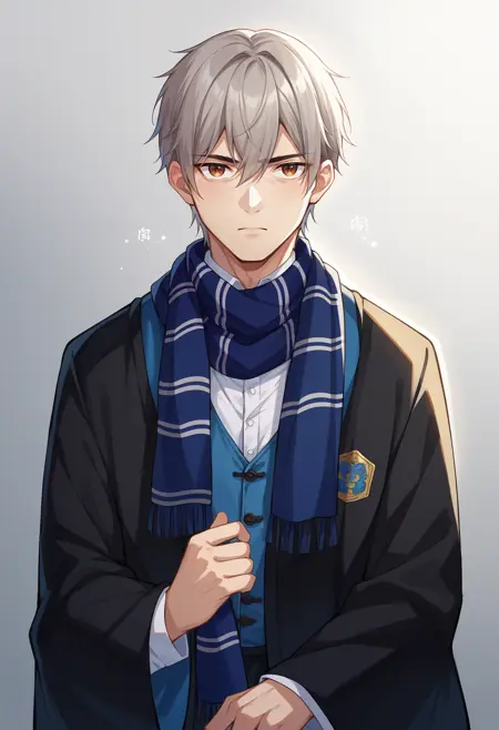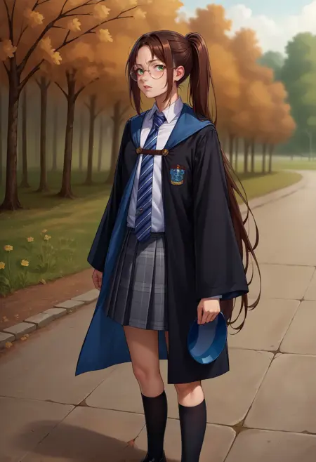 Trigger with: EPRobeRavenclaw, wearing EPRobeRavenclaw and use keywords collared shirt, open robe, white shirt, emblem, black robe, blue necktie, striped necktie, wide sleeves, long sleeves and add items like grey sweater, black sweater, black pants, grey skirt, whatever... I used a weight of 1.0 for my pictures. It seems that some character loras need the a higher weight on the outfit.